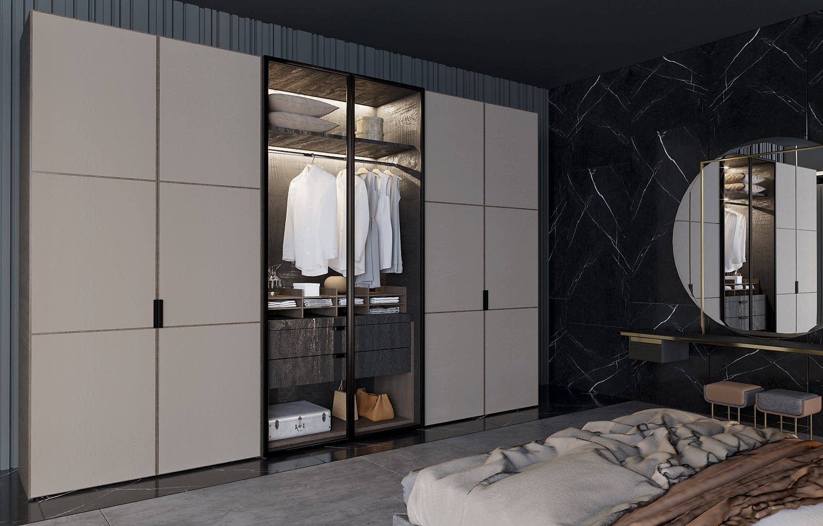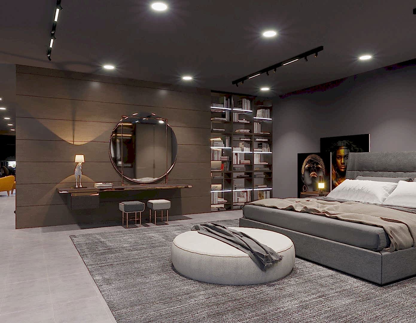 Cosy Black Yatak Odası, modern tasarım çizgileriyle sade ve şık bir atmosfer yaratıyor. Yatak başlığı, odanın merkezi öğesi olarak kullanılmış ve koyu gri tonları ile odanın genel havasına uyum sağlıyor. Işıklandırma ise mekânın her köşesini aydınlatarak, sıcak bir ortam yaratırken, odadaki minimalistik dokunuşları da ön plana çıkarıyor. Aynı zamanda, zarif ve modern mobilyalar, estetik açıdan dengeli bir görünüm sunuyor, özellikle raf düzenlemeleri ve şık aksesuarlara yer verilmiş. Yatak odasında kullanılan sade renkler ve kaliteli malzemeler, ortamın rahatlatıcı etkisini pekiştiriyor.