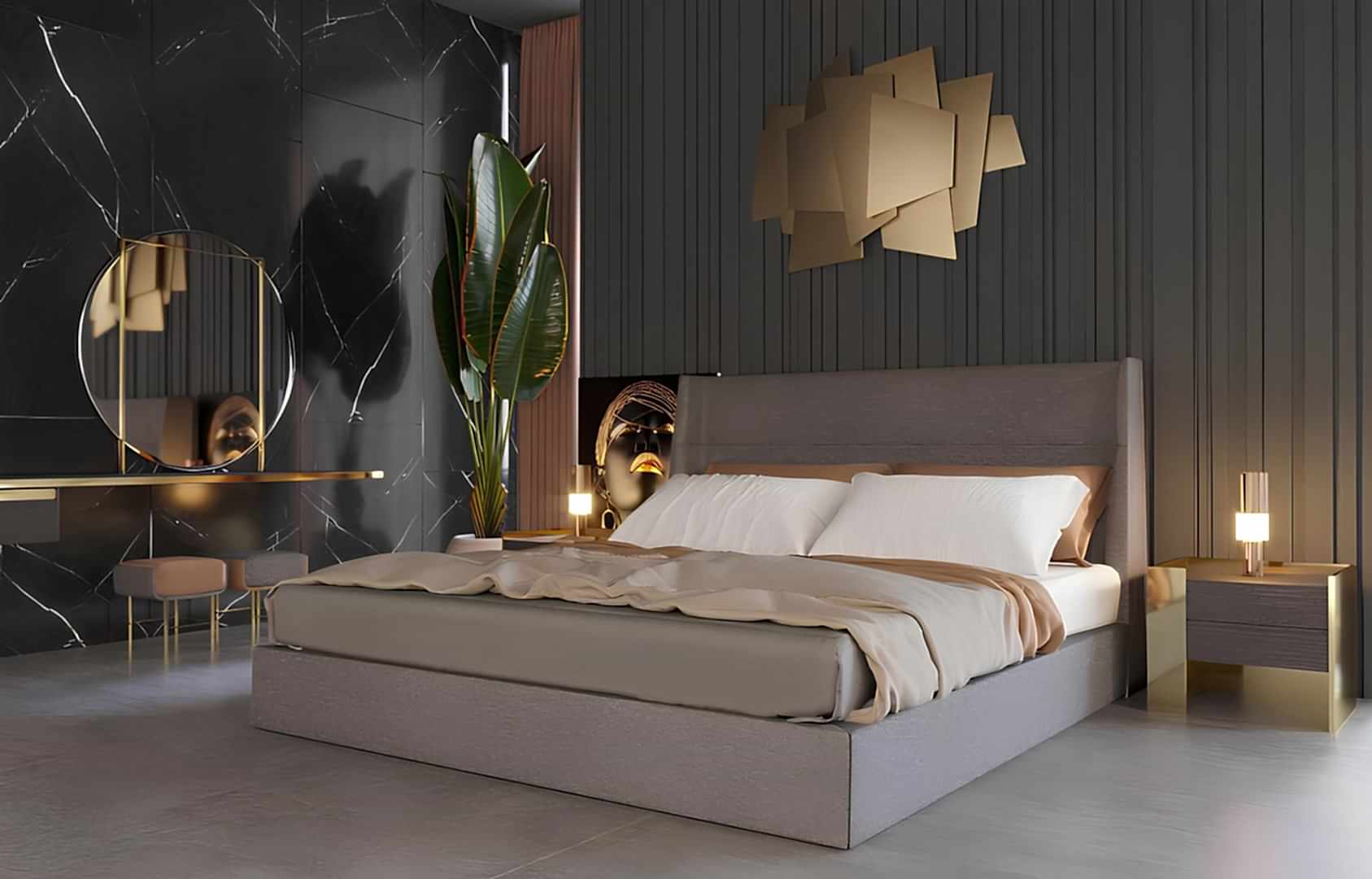Cosy Yatak Odası Takımı, modern zarafeti ve rahatlığı bir arada sunarak her türlü yaşam alanına uyum sağlar. Yatak başlığındaki şık kumaş dokusu ve zarif metal detaylar, estetik açıdan göz alıcı bir uyum yakalar. Parlak altın detaylar, gece lambalarından komodinlerin ayaklarına kadar her parçaya zarif bir dokunuş eklerken, ince çizgiler ve modern aydınlatma unsurları da odanın atmosferini lüks ve sofistike bir hale getirir. Bu tasarım, kullanıcıya görsel bir güzellik sunmanın yanı sıra, dinlendirici ve rahatlatıcı bir ortam yaratır, her detayda kalite ve konforu barındırarak iç mekânlarınıza modern bir hava katar.