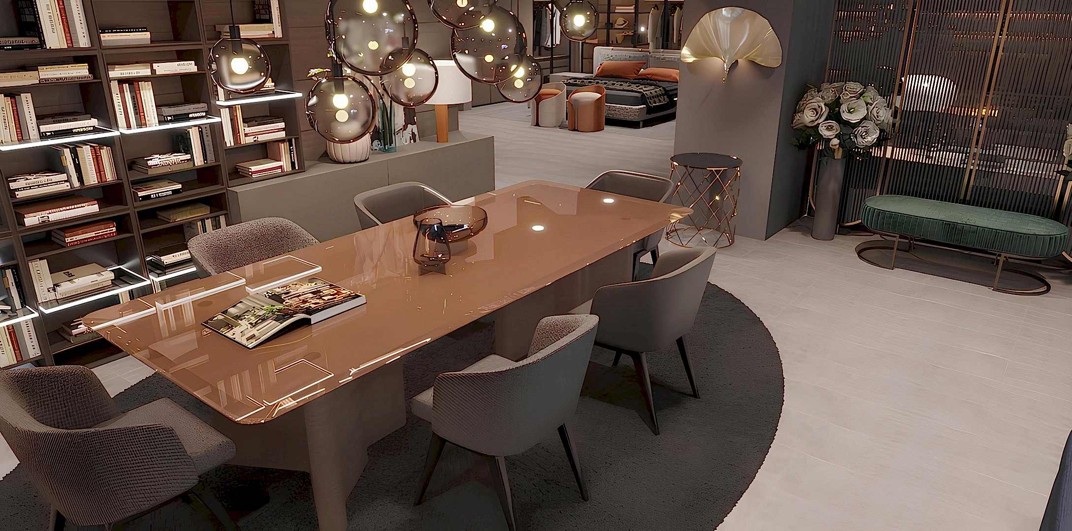 Bu takım, özellikle açık plan yaşam alanları ve lüks rezidanslar gibi geniş kullanım alanlarında yemek ve yaşam fonksiyonlarını birleştirmek için idealdir. Arka plandaki entegre kitaplık ve dekoratif aydınlatmalar, alana derinlik ve zenginlik katar. Fonksiyonelliği maksimize eden bu tasarım, masanın parlak yüzeyi ve yuvarlak hatlı oturma bankı gibi aksesuarlarla tamamlanarak, hem gündelik hem de özel davetler için şık ve bütüncül bir ortam sunar.