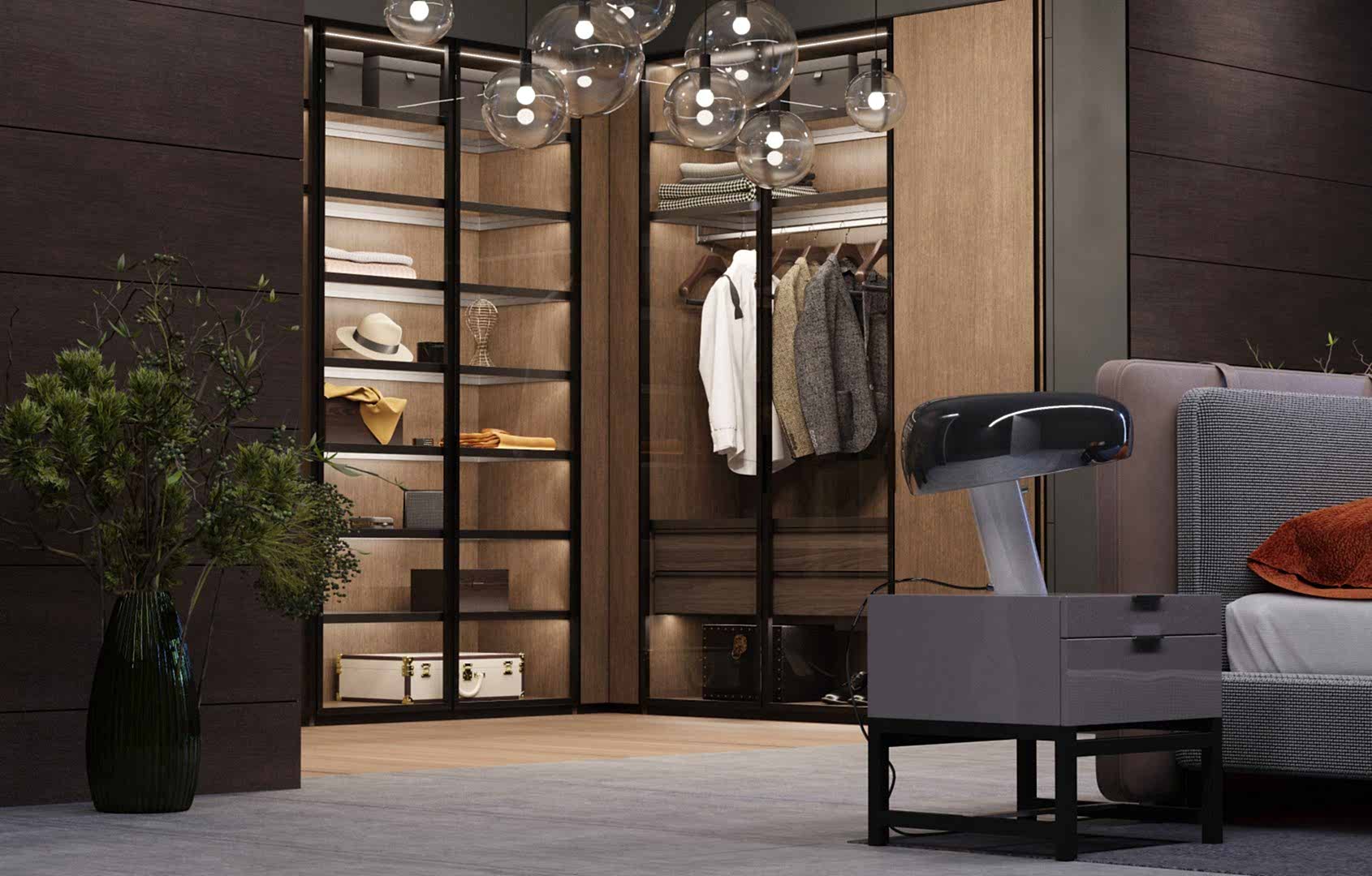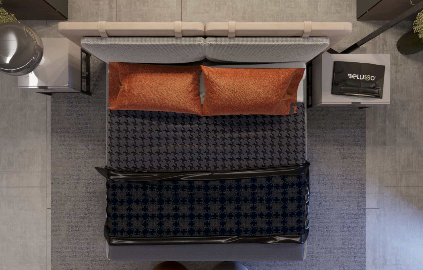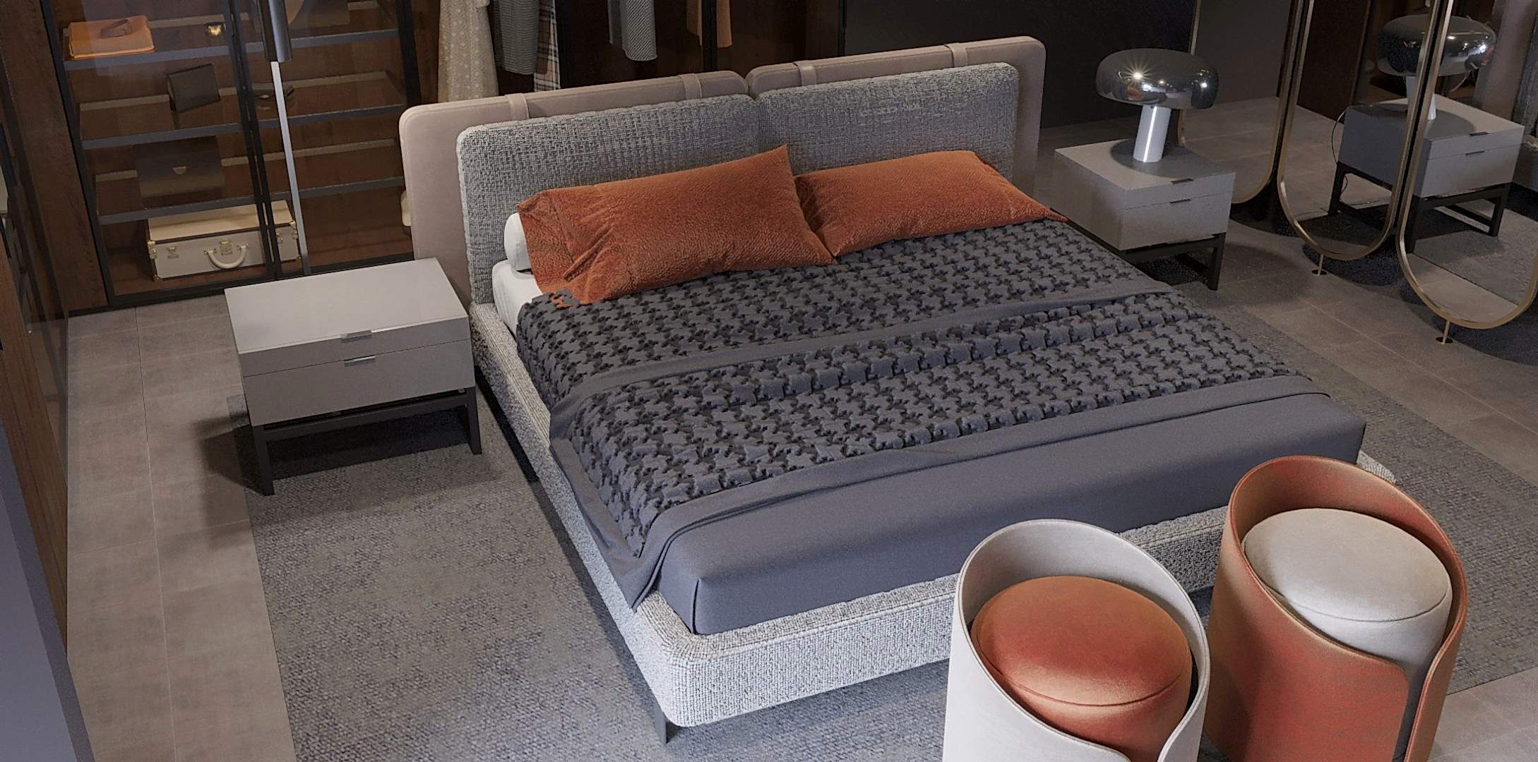 Silver Yatak Odası takımı, modern lüks ile pratikliği mükemmel bir şekilde birleştiriyor. Zarif yatak başlığı, temiz hatlar ve ince dokularla tasarlanmış olup, odada sıcaklık ve enerji katan turuncu yastıklarla mükemmel bir uyum yakalıyor. Tasarımın dikkat çeken özelliklerinden biri, açık raflar ve askı alanlarıyla birleşen şık dolap sistemi, hem fonksiyonellik hem de görsel açıdan etkileyici bir yapı sunuyor. Aydınlatma, zarif sarkıt lambalarla yumuşak ve davetkar bir ışık sağlamak üzere özenle tasarlanmış. Minimalist komodinler ve modern dairesel tabureler gibi tamamlayıcı detaylar, şıklığı artırırken, aynı zamanda konfor ve kullanım kolaylığı sağlıyor. Bu tasarım, her detayı özenle düşünülerek oluşturulmuş, şık ve rahat bir kaçış alanına dönüştürür.